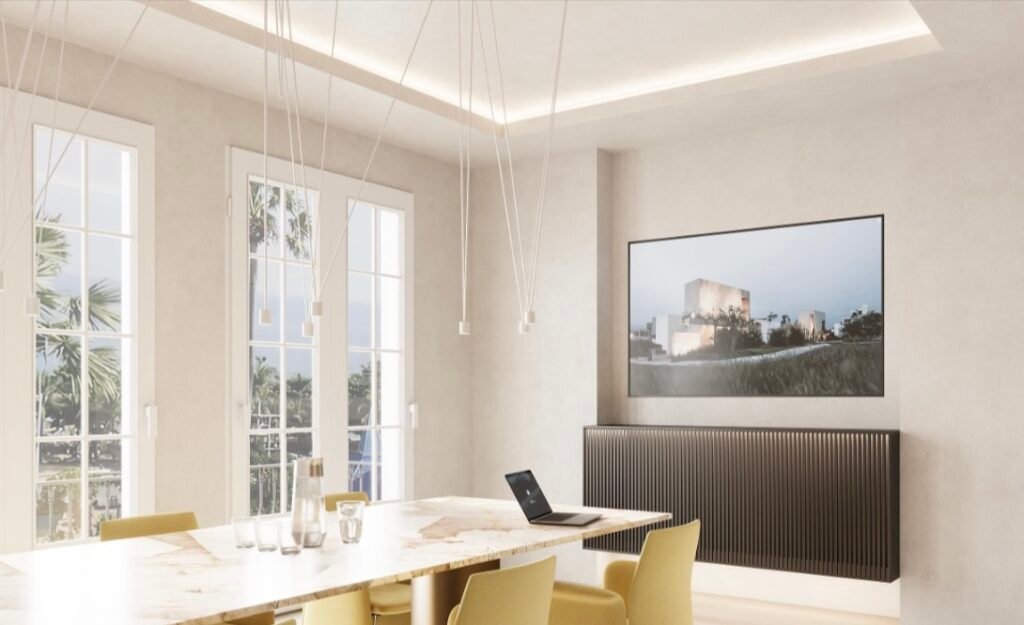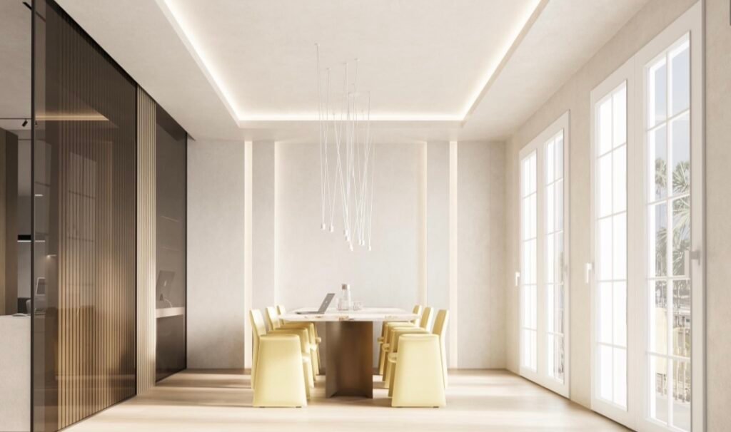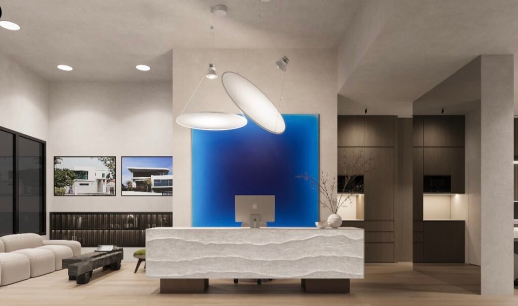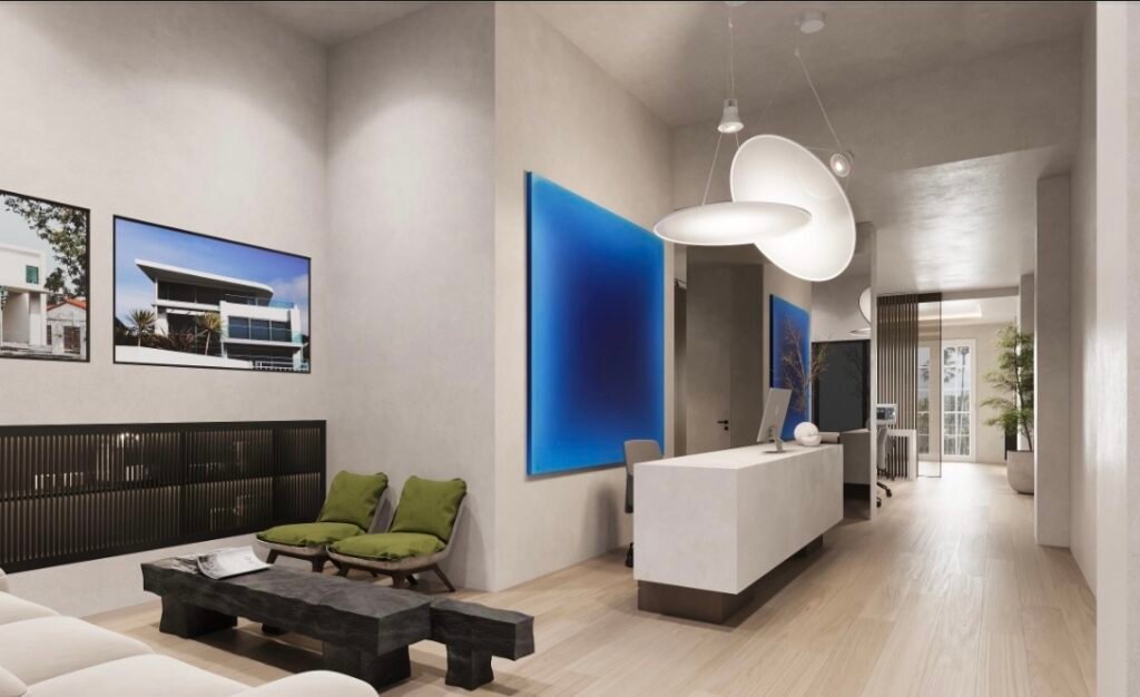 This 113 m² office project is designed to foster fluidity and collaboration with an open-plan layout, optimized for a dynamic work environment. The meeting room, separated by a glass partition, provides both privacy and transparency, allowing for seamless communication while maintaining the confidentiality of discussions. The entrance features an elegant reception area, serving as a connection point between the workspace and the welcoming zones. The design combines natural materials such as raw wood and micro-cement, bringing warmth and modernity to the space. The choice of materials, along with abundant natural light, creates an atmosphere that is both inviting and professional, enhancing productivity.