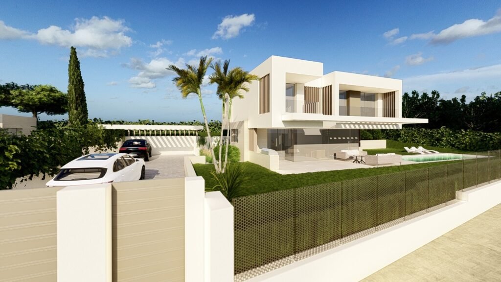 This modern Mediterranean villa showcases a striking façade made of natural stone and micro-cement, blending rustic elegance with contemporary sophistication. The earthy tones of the stone complement the sleek, smooth finish of the micro-cement, creating a harmonious balance between tradition and modernity. Inside, the villa boasts four en-suite bedrooms, each offering privacy and comfort. Expansive windows open onto the spacious living areas, which seamlessly connect to the outdoor terrace and infinity pool. The design emphasizes clean lines, natural materials, and a serene, luxurious atmosphere.